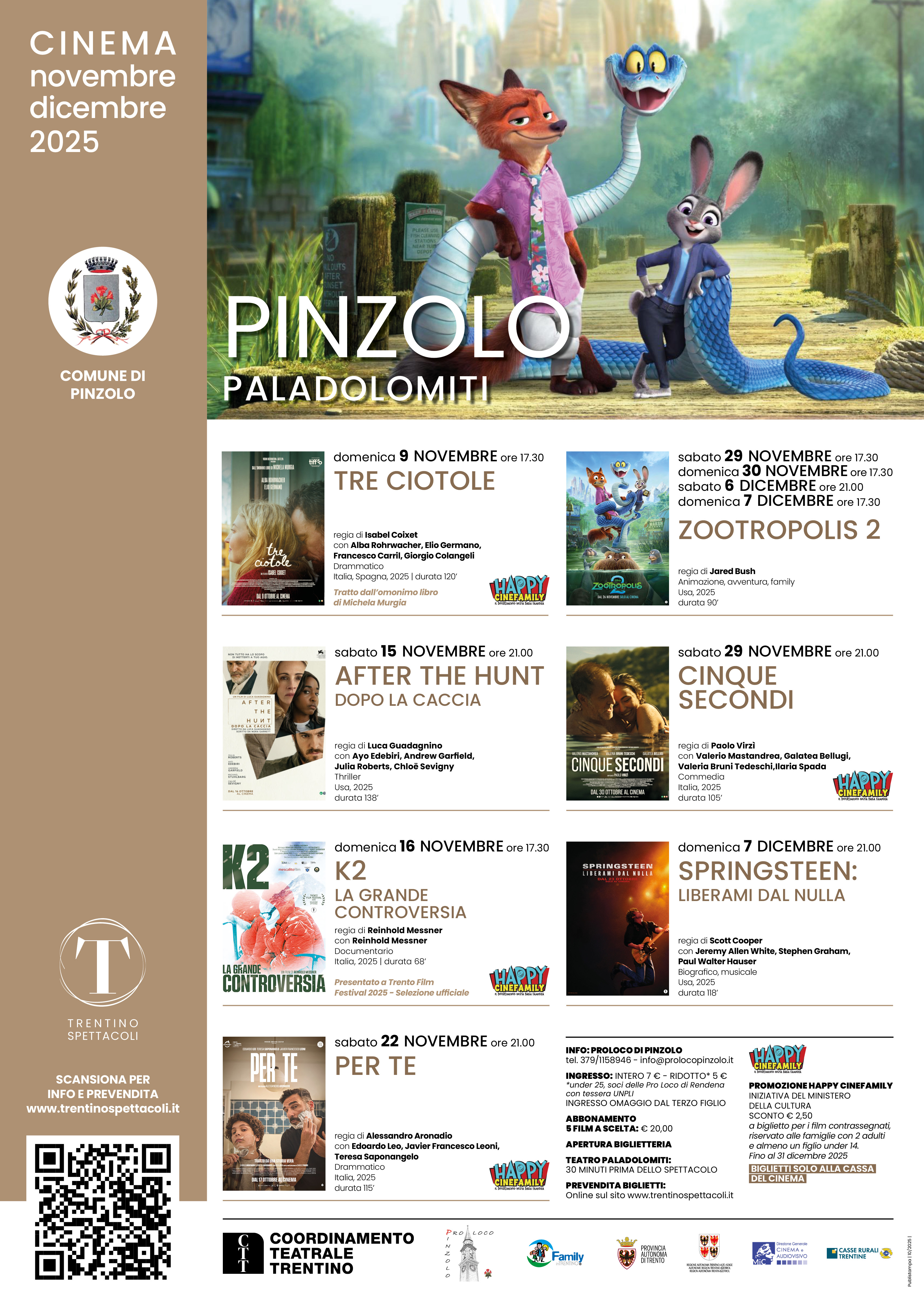 Anche a novembre prosegue la programmazione cinematografica presso il PalaDolomiti di Pinzolo grazie alla collaborazione fra Comune di Pinzolo Coordinamento teatrale trentino e la Pro Loco di Pinzolo