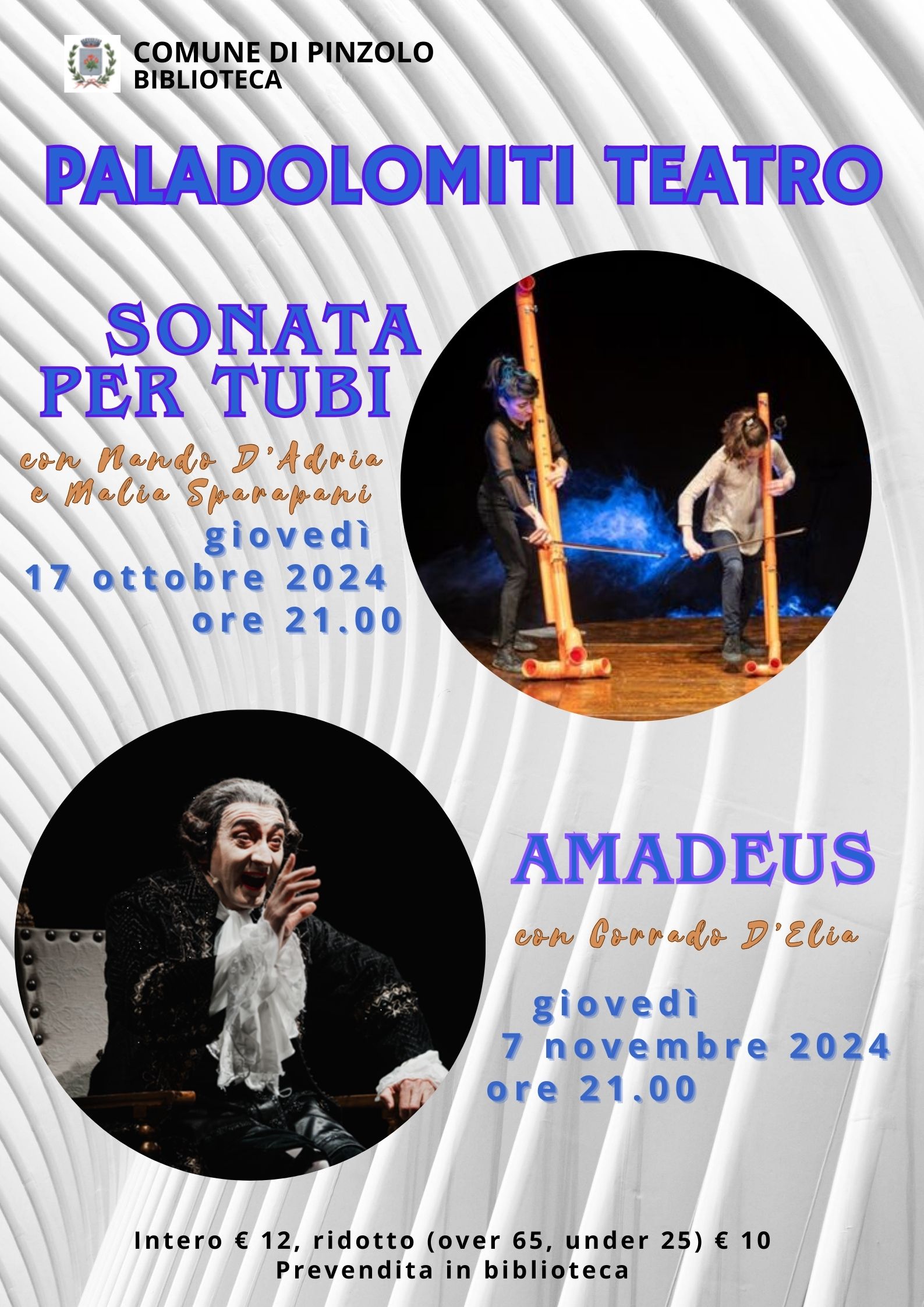 Due spettacoli teatrali ispirati alla musica vengono proposti al Paladolomiti. Giovedì 17 ottobre 2024 andrà in scena Sonata per tubi proposta dalla compagnia Nando e Maila, mentre giovedì 7 novembre Corrado d'Elia ci racconta quel genio di Amadeus Mozart