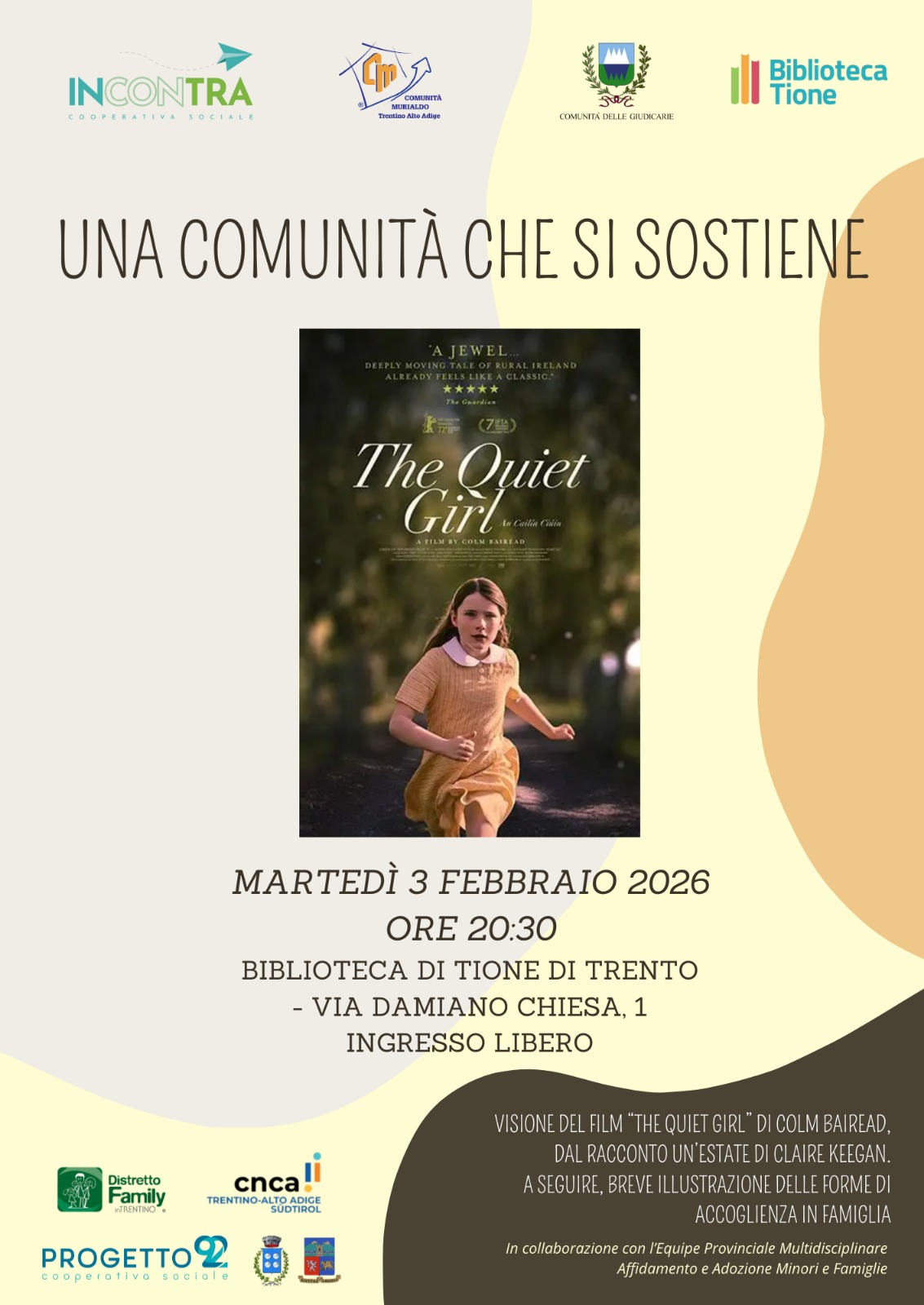 Presso la Biblioteca comunale di Tione di Trento si terrà una serata informativa "Una comunità che si sostiene" con proiezione del film: "The quiet Girl" w una breve illustrazione delle forme di accoglienza in famiglia.
